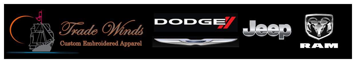 Custom embroidered caps, shirts, gear bags, and displays for Dodge Chrysler Jeep Ram dealerships in North America.